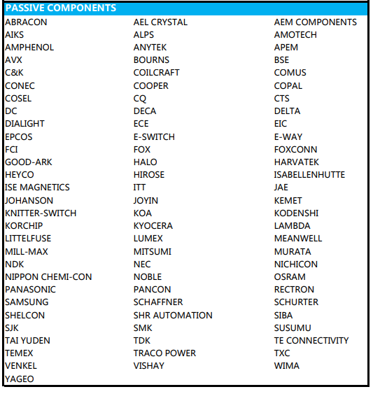 我公司提供一站式的采购服务,为客户提供节约时间和降低成本的有效采购方案。我公司可提供的货源种类多样,包括主动元器件(各类集成电路丶微程式控制器MCU丶中央处理机CPU丶快闪记忆体MEMORY丶二三极管丶可控硅丶长效应管等)及被动元器件(各类型电容丶电感丶开关丶插头丶保险丝丶继电器丶电阻等),我们涉及的元器件品牌多达260个以上,基本囊括了目前主流的元器件品牌。为满足客户对各种物料的需求,从常规型号到停产或冷门型号,凭借强大的采购网络和完善的供应链体系,我公司专业的团队定能协助您找到所需物料。